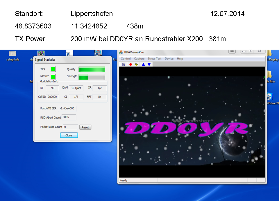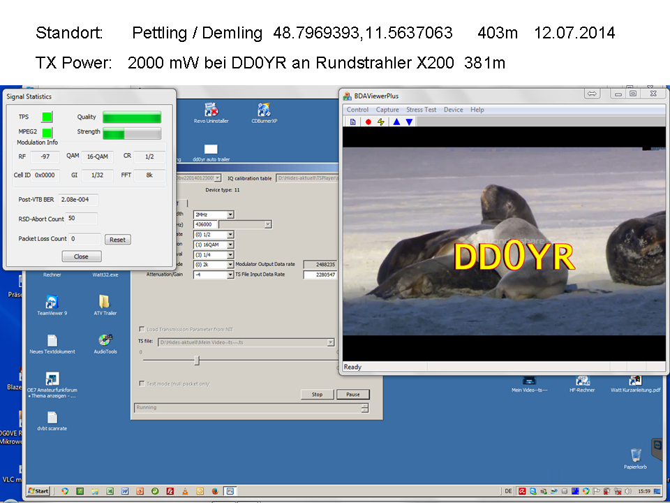 12-Juli-2014 Ein neuer DVB-T Ausbreitungsversuch. Teststandorte waren, Lippertshofen mit 200mW Sendeleistung und Pettling mit 2W Sendeleistung. Beide Standorte lieferten ein ausgezeichnetes Bild mit 100 %iger Qualität. Der Abstand zum Sender war in beiden Fällen ca. 7 Km. Neustadt/Grillheim Neustadt/DD0YR