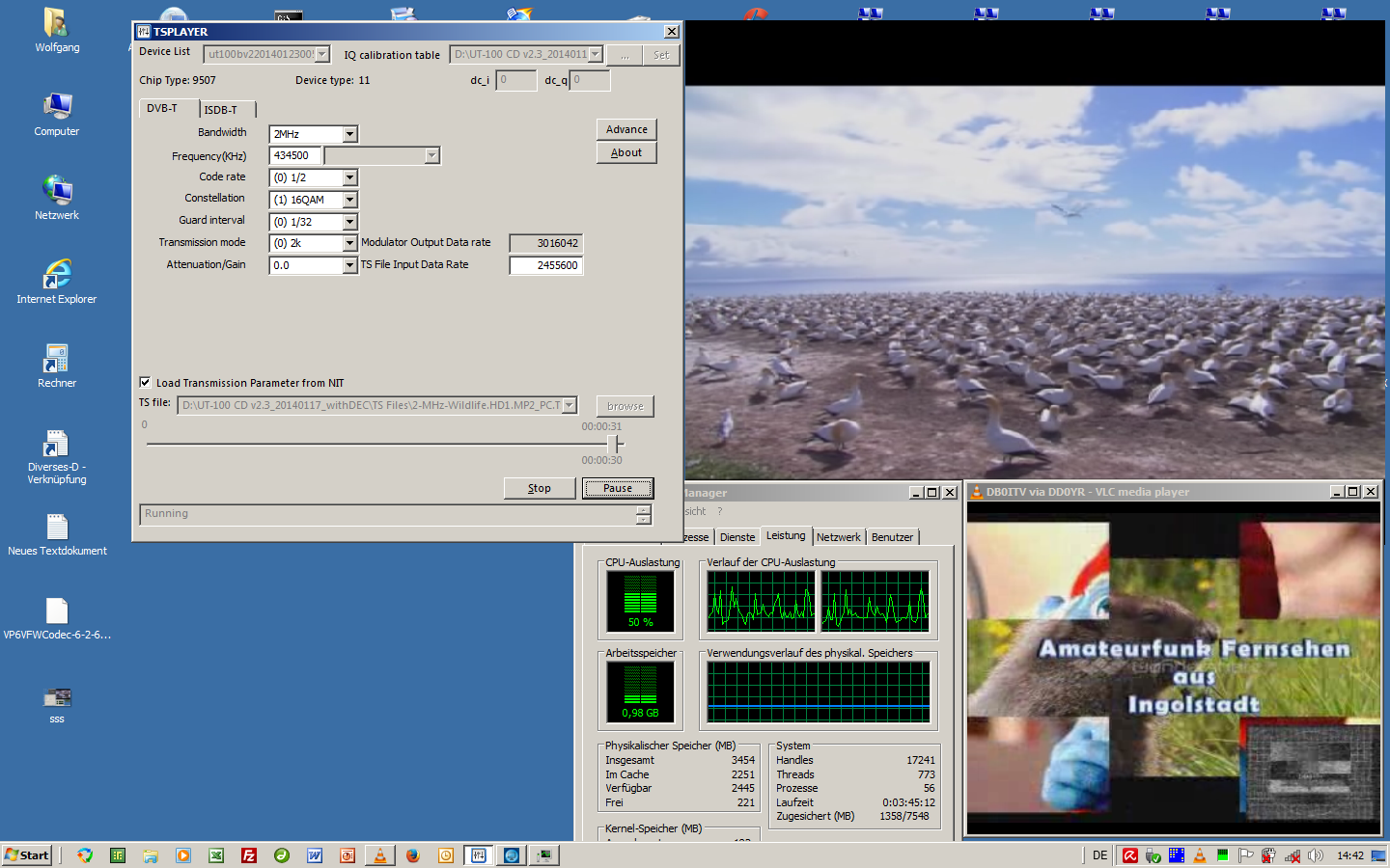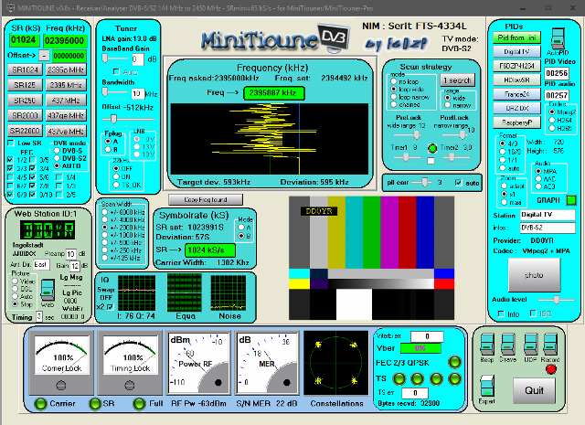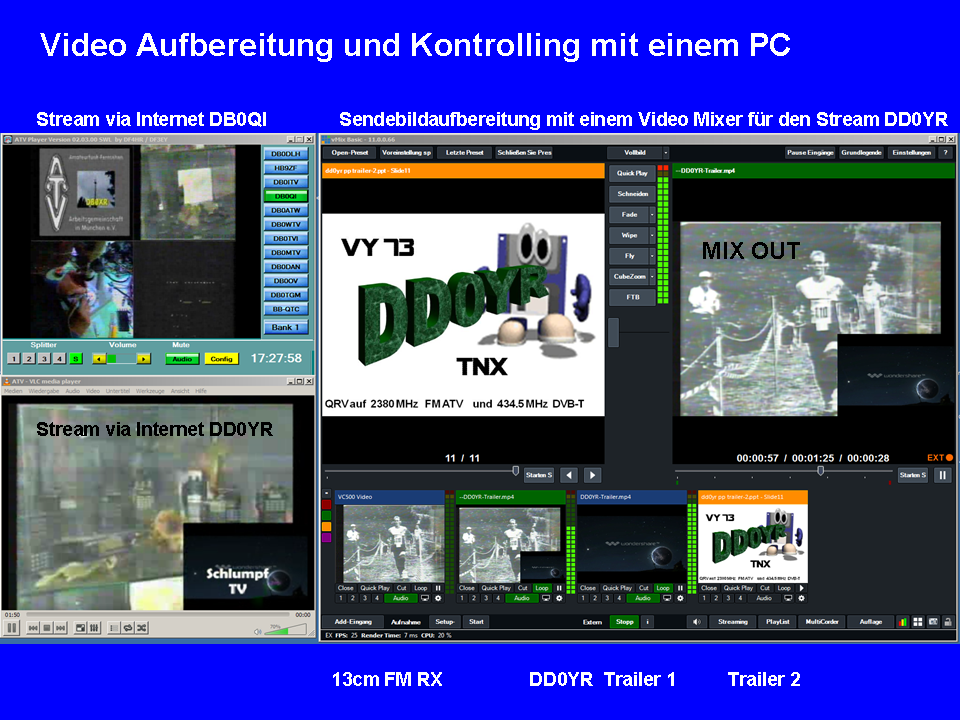 25-April-2014 wie so oft liegt der Fehler zwischen den Kopfhörern.Die Betriebsanleitungen und oder Softwarebeschreibungen werden erst dann gelesen wenn alles Andere erfolglos war. So auch dieses Mal. Die richtige SW genommen, alles richtig eingestellt uns schon läuft die Kiste. Anschliessend kam der erste ausgiebige Testlauf. DVB-T senden, DVB-T empfangen mit unterschiedlichen Rechnern. Übertragen von Videos im *.ts Vormat, übertragen von Kamerabild und PC Bild. Das Ergenis kann sich sehen lassen. Kritisch wird es wenn der Sende PC nicht genug performance hat, dann kommt es zu Aussetzern im Bild wenn z.B. die Software der WebCam oder ähnliches zu viel Leistung fordert. Bei der Übertragung eines Videofilmes, oder der PC Oberfläche (egal welcher Inhalt) entstehen keinerlei Probleme. Das Empfangssignal auf dem ausschließlich dafür benutzten PC war problemlos. Abbild des Mix-Bildschirm