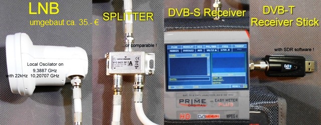 22-Mai-2014 Zufällig bin ich heute auf einen Beitrag von OE5MLL gestoßen, welcher eine mögliche, preiswerte Alternative zum Empfang von 70cm DVB-T Signalen via Up-Converter und einem herkömmkichen SAT-Receiver darstellt. Ich habe mich mal bei OE5MLL gemeldet und ihn um nähere Informationen gebeten. Mal abwarten was sich daraus ergibt. DVB-T via UpConverter